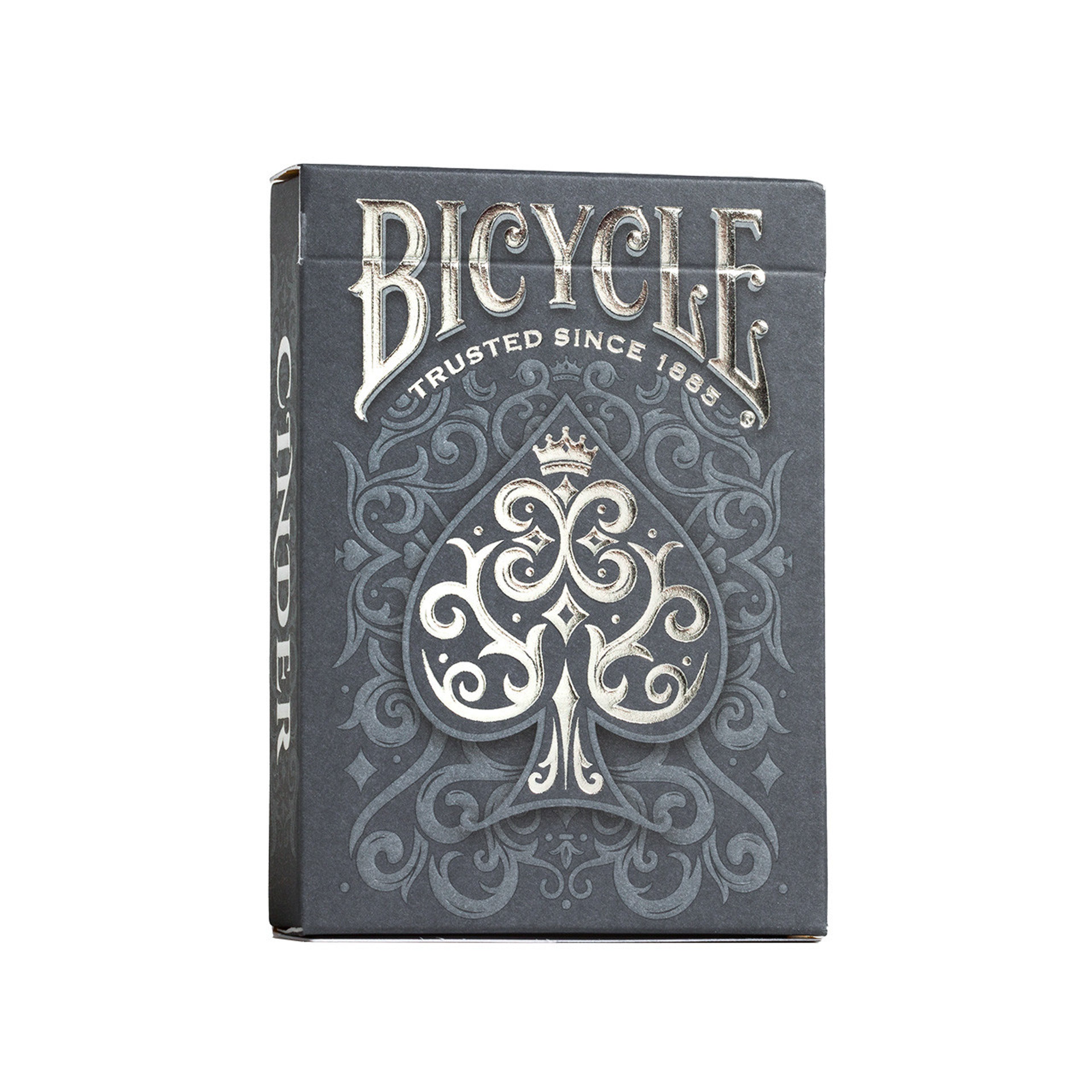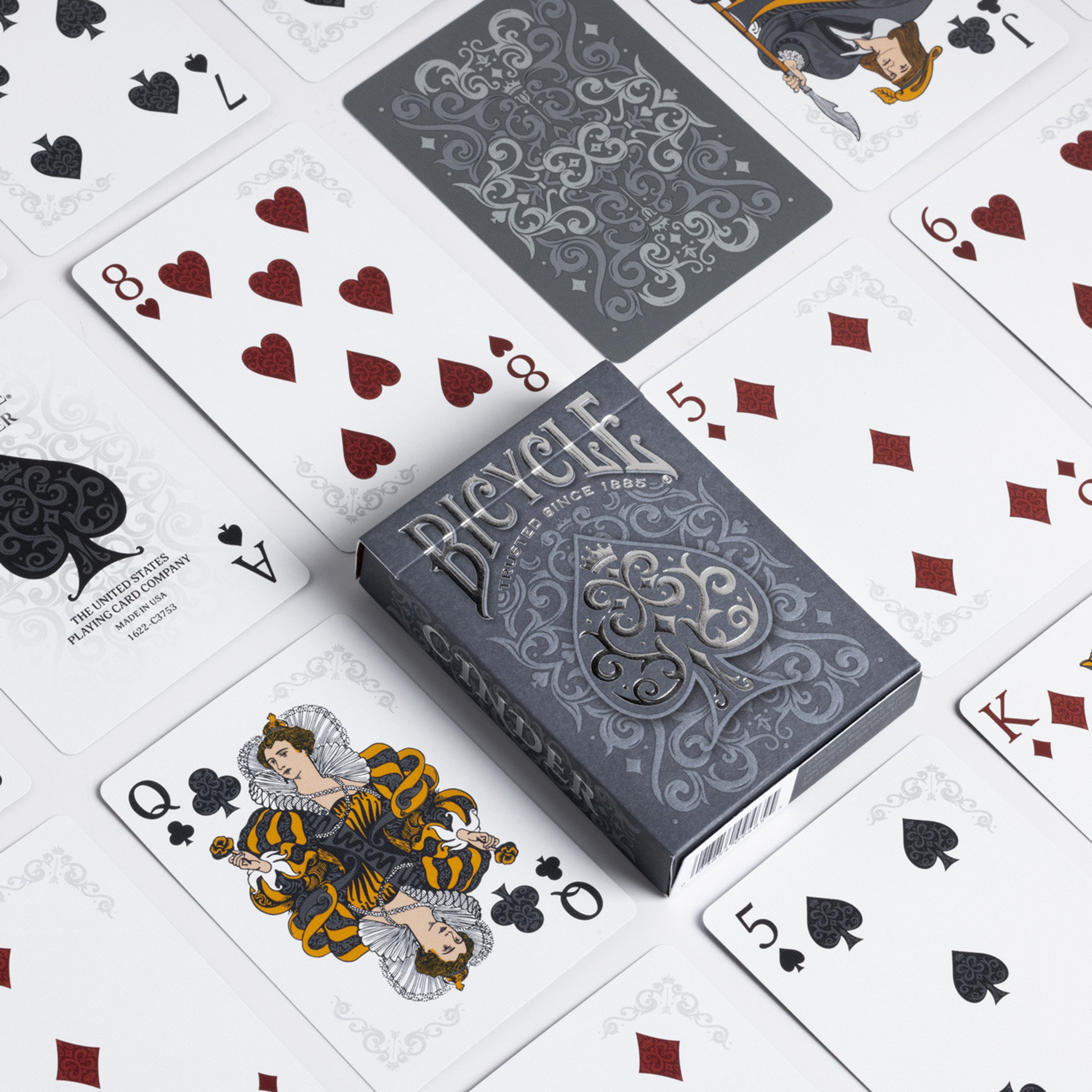 La baraja Bicycle Cinder está inspirada en el elegante y misterioso remolino de humo que flota sobre los fuegos ardientes. El diseño del estuche presenta varios tonos de grises cenizos e incluye una lámina plateada brillante con dos niveles de relieve para un efecto tridimensional. También incluye un sello de cierre personalizado. El interior del pliegue está impreso con colores cálidos y dorados, que representan las brasas brillantes de las que emerge el humo.