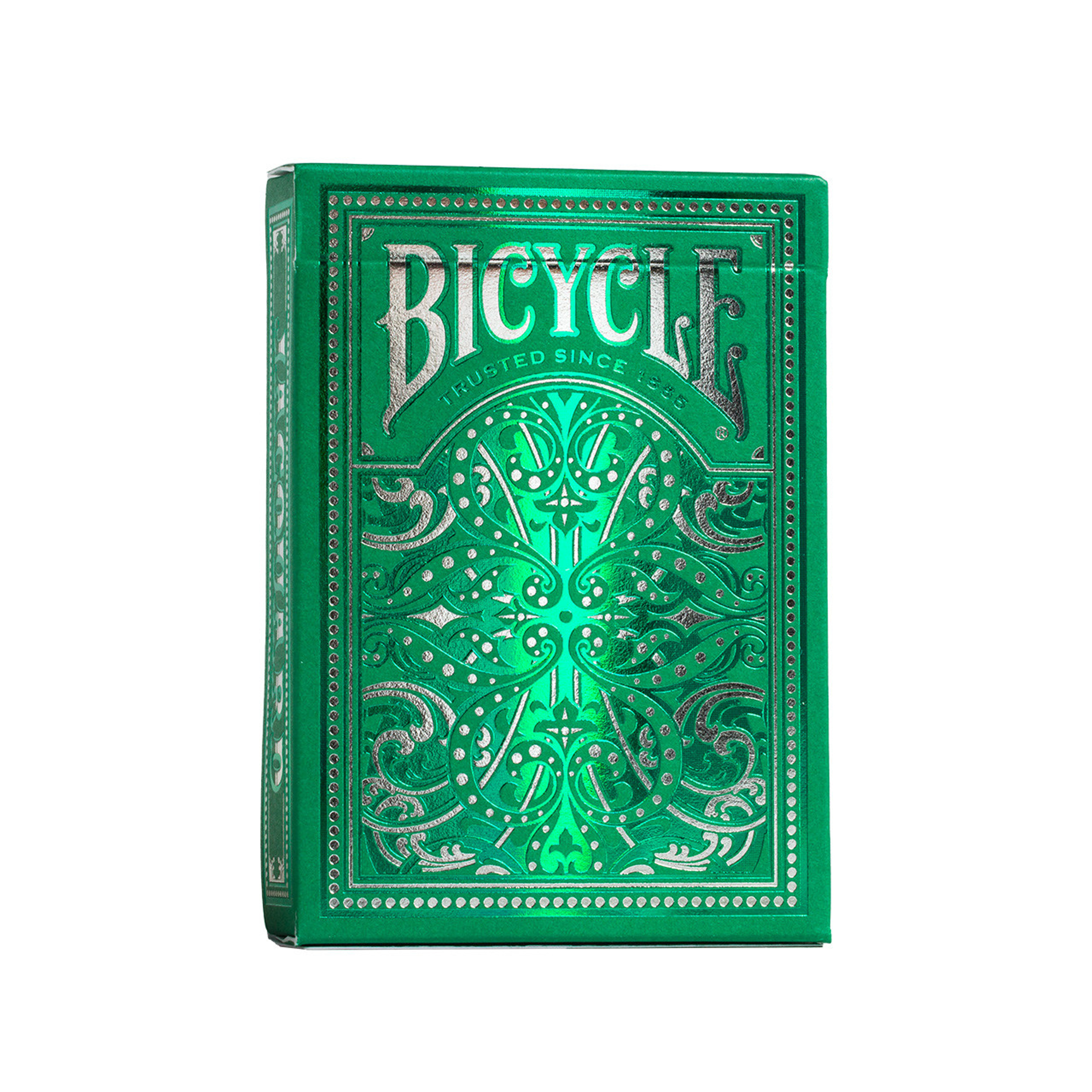 La Bicycle Jacquard se inspira en el diseño de patrones complejos y ornamentados. El estuche presenta detalles con foil plateado y verde esmeralda entretejidos creando una deslumbrante atracción. Así como las máquinas Jacquard revolucionaron los telares con su "cadena operastiva de cartas", esta baraja de cartas premium ha sido diseñada y fabricada con la misma sofisticación y tecnología innovadora.