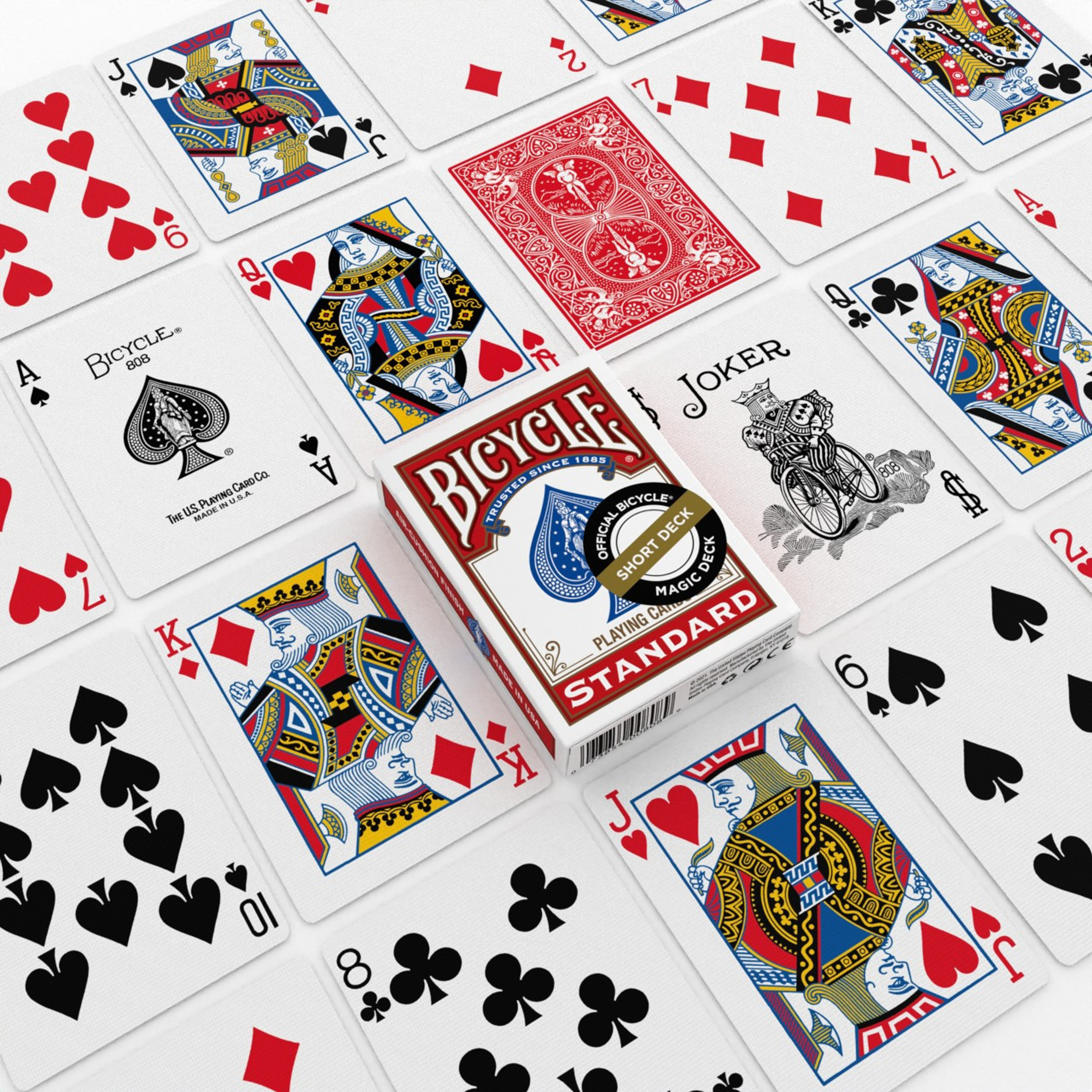 Las cartas de la baraja corta son ligeramente más cortas que las de una baraja estándar. Esta es una baraja completa de cartas cortas de 1/32". Combina cualquiera de estas cartas de la baraja corta con la baraja Bicycle Estándar del mismo color para crear tu baraja personalizada y forzada.