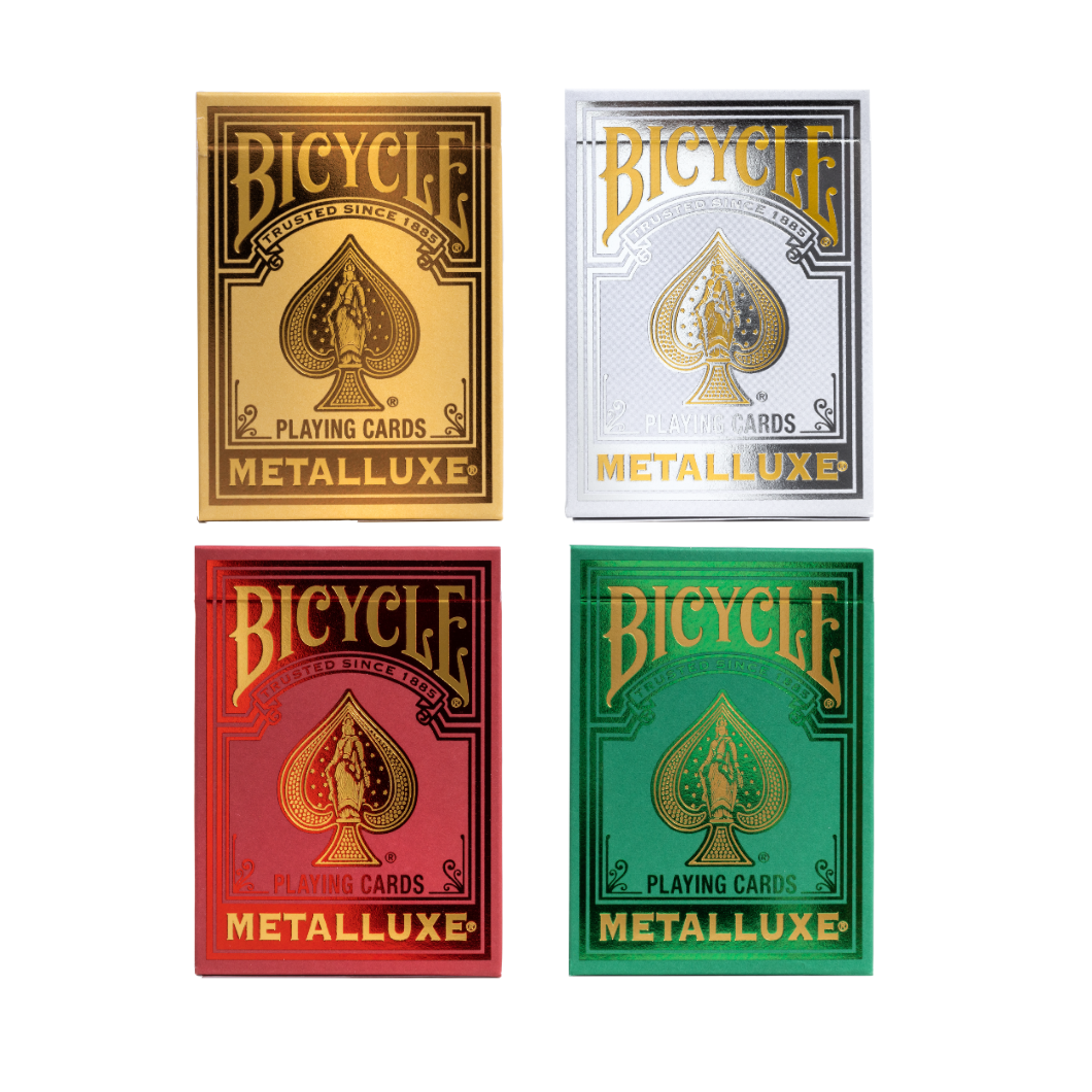 This stunning 4-deck set includes gold, silver, red, and green Metalluxe® playing cards, each featuring our signature luxurious foiling on every card. The shimmering design elevates every shuffle, deal, and flourish, making this set a collector’s dream and a perfect holiday gift.