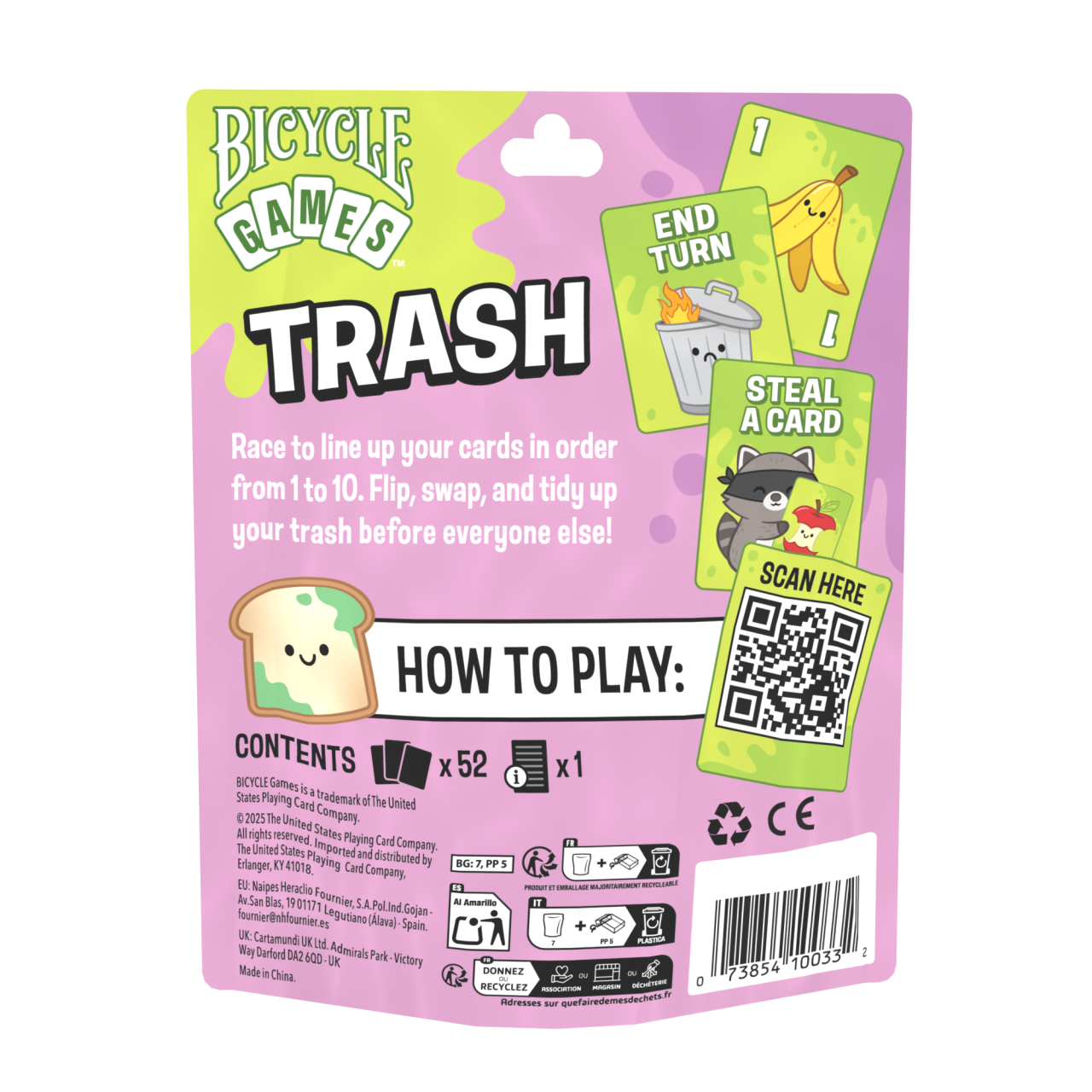 Ready to tidy up your trash and win the day? Bicycle Games: Trash is a fast, feel‑good family card game where players race to flip, swap, and line up cards from 1 to 10—with Wild Trash Can cards to help and Raccoon cards that can cut your turn short. It teaches number sequencing in minutes and delivers giggles, light strategy, and “one more game!” energy for ages 6+.